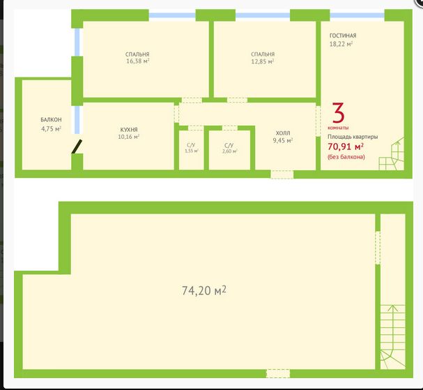 Продажа Новостройка 3 комн., Элитная, 70,91/47,45/10,6, 3/3, Сухумская ул., 30/10, Железнодорожный, 3 233 496 р.